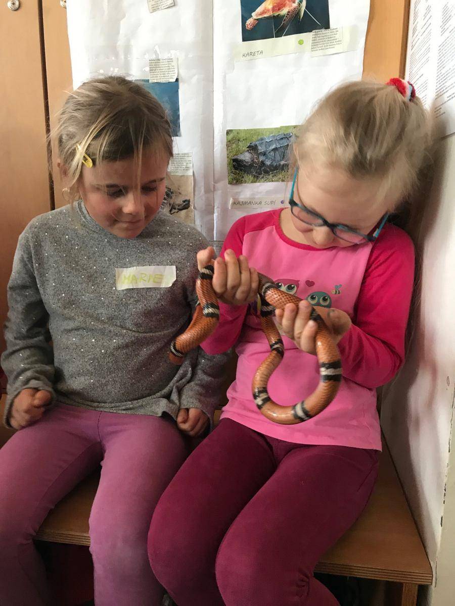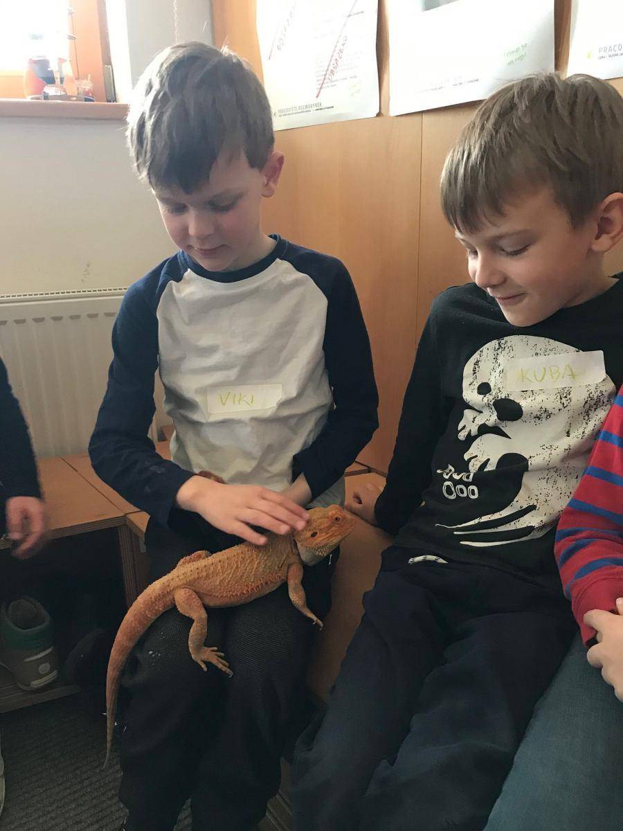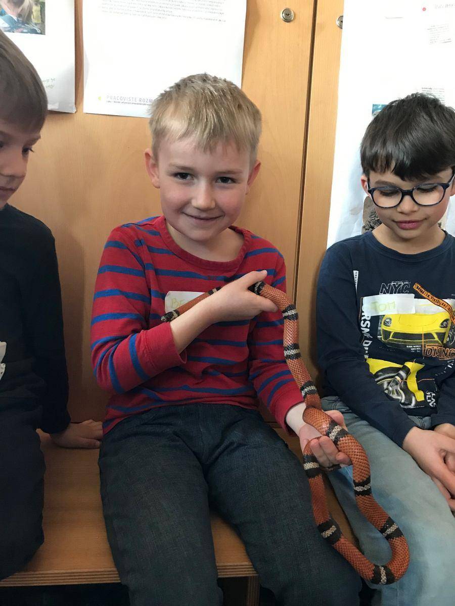 Ve čtvrtek 23. 3. se děti z 1. třídy zúčastnily programu na Rozmarýnku – Kam se plazí plazi. Dozvěděly se, jak se starat o různé druhy plazů a co potřebují k životu. Mohly si pohladit a vzít na klín chameleona, hada, želvu a vlastnoručně nakrmit agamu. Samy si vyrobily malou želvičku z vlny, kterou si odnesly domů. Na závěr programu měly možnost nakrmit i ostatní zvířátka na zahradě.