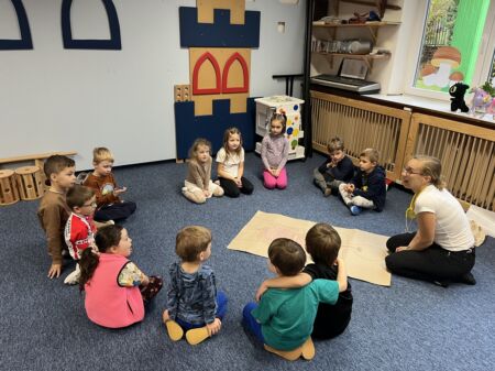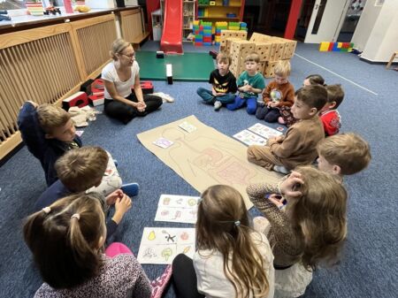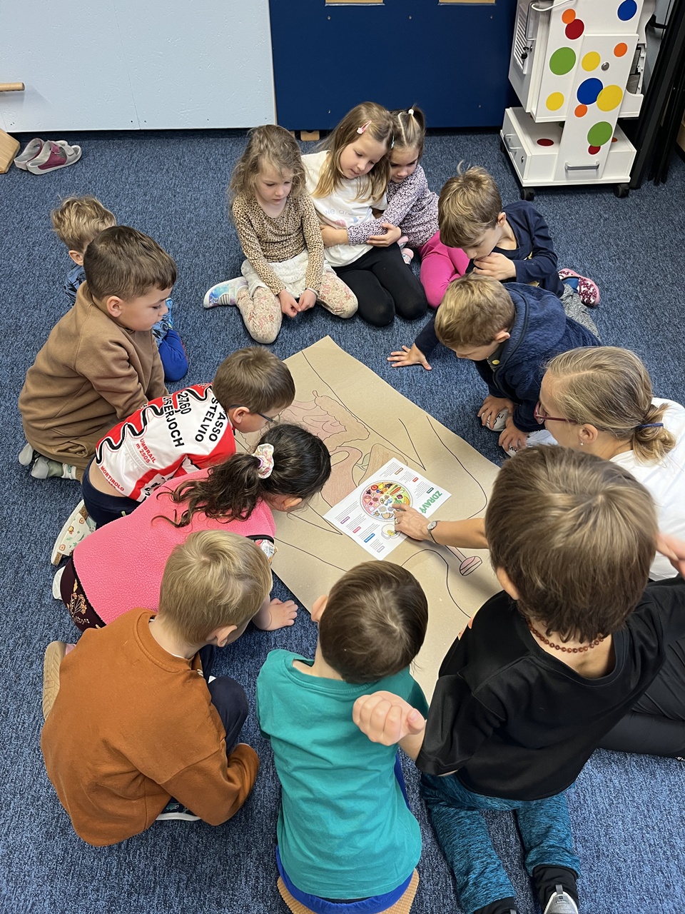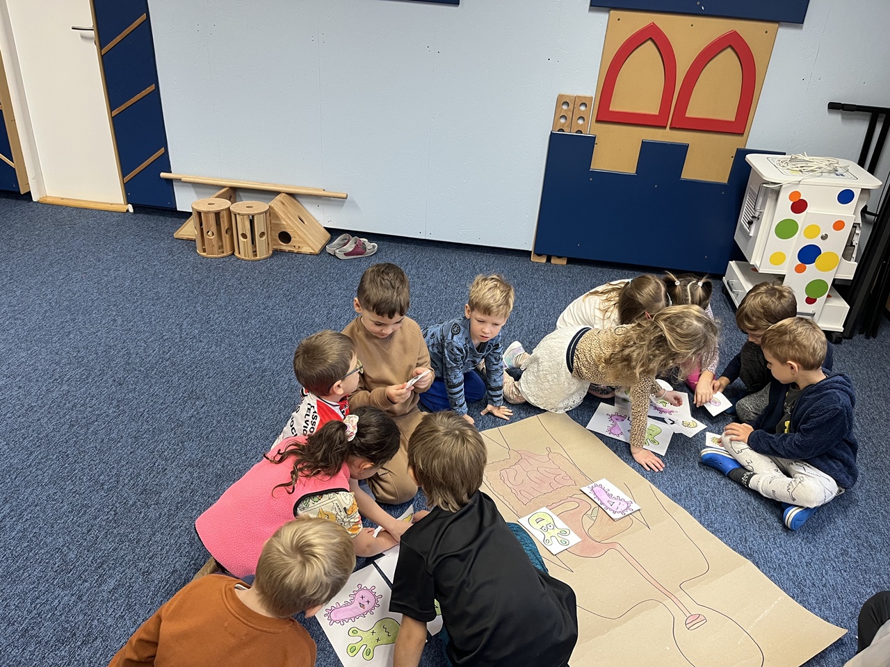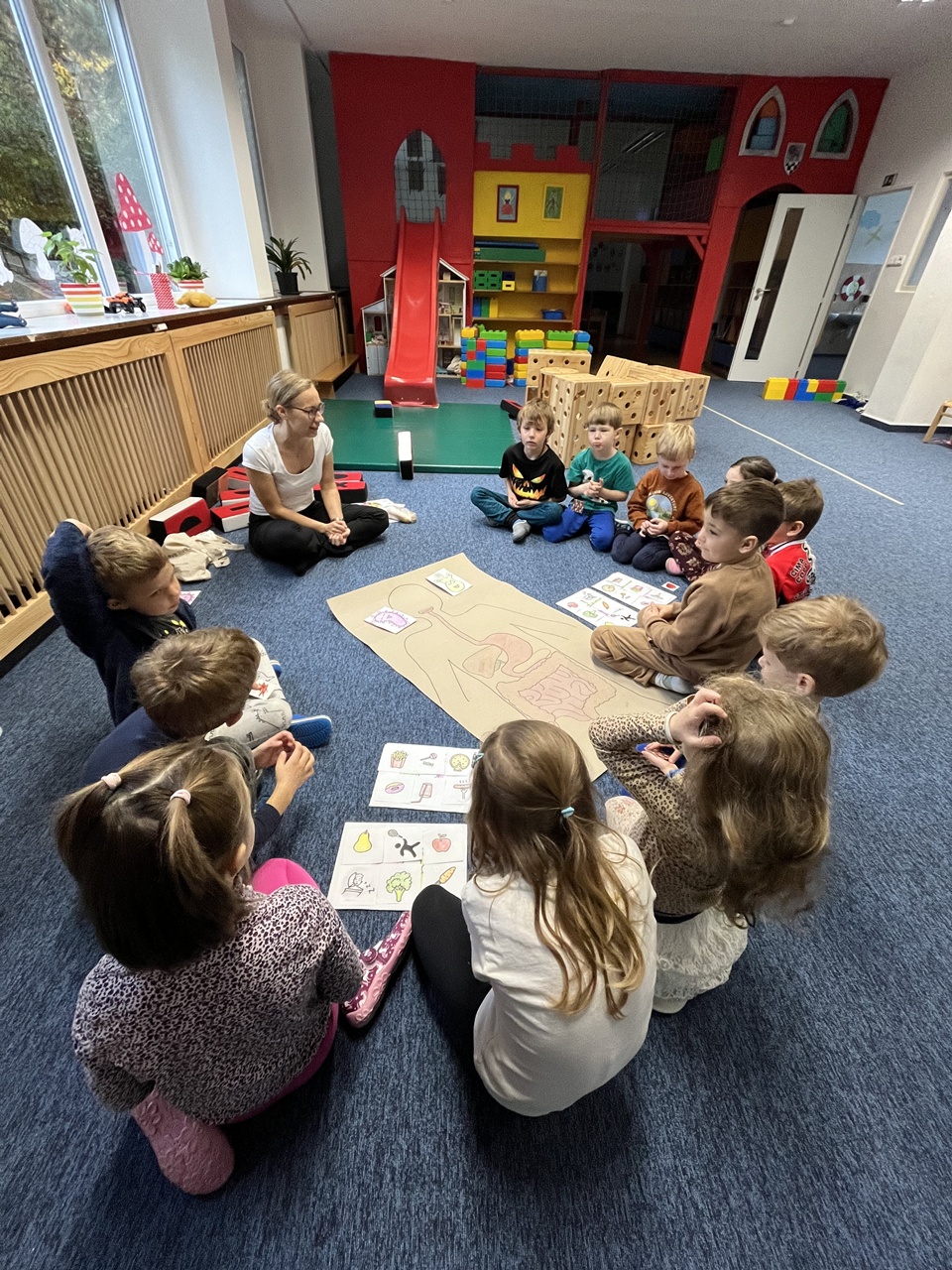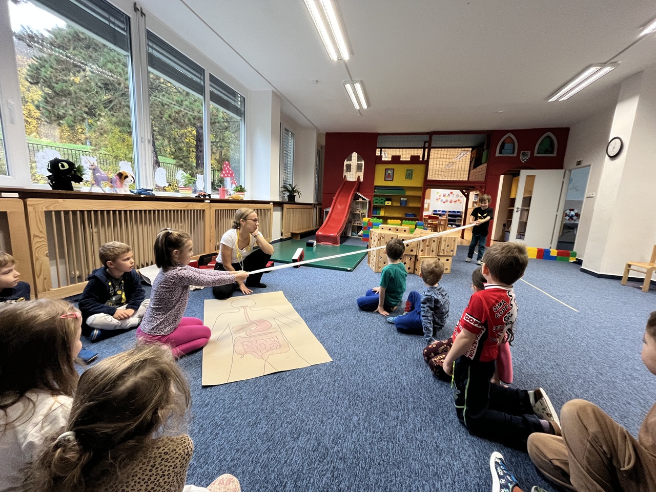 Pro děti měla krásně a poutavě připravené povídání na téma střeva, zdravá a nezdravá strava. Děti pěkně spolupracovaly a odpovídaly na otázky. Vyzkoušely si, jak jsou dlouhá střeva, a poslechly si, jak tluče srdce. Besedu si moc užily a odnesly si z ní mnoho užitečných informací.