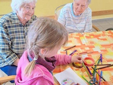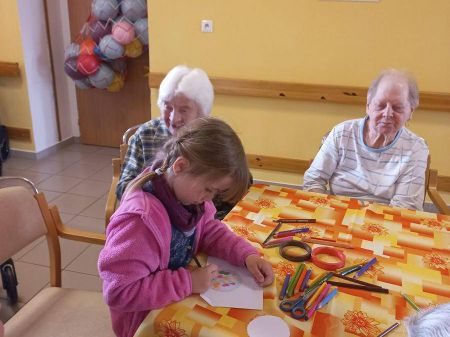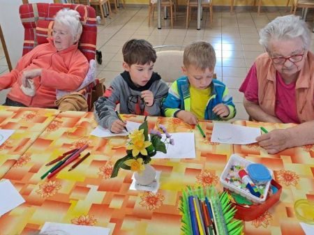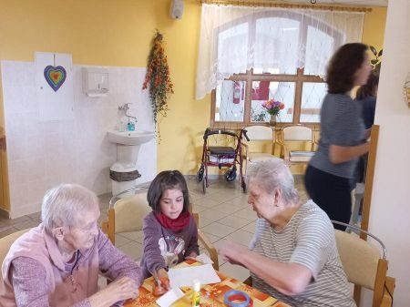 Návštěva dětí a společné zpívání byl pro nás všechny po překonání počátečního ostychu velký zážitek. Společnými silami jsme tvořili obrázky, které jsme věnovali jak seniorům tak našim maminkám. Mohli jsme navštívit i přilehlý parčík, kde senioři tráví volný čas. Děti zaujaly zlaté rybky v malém jezírku a leguán v kanceláři pana ředitele.