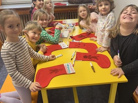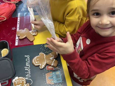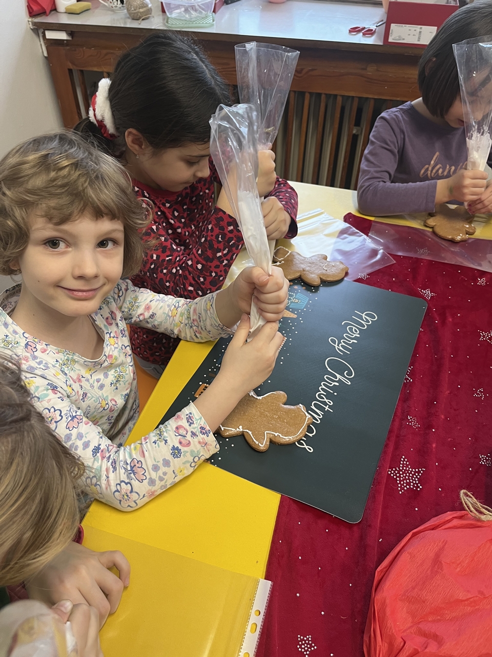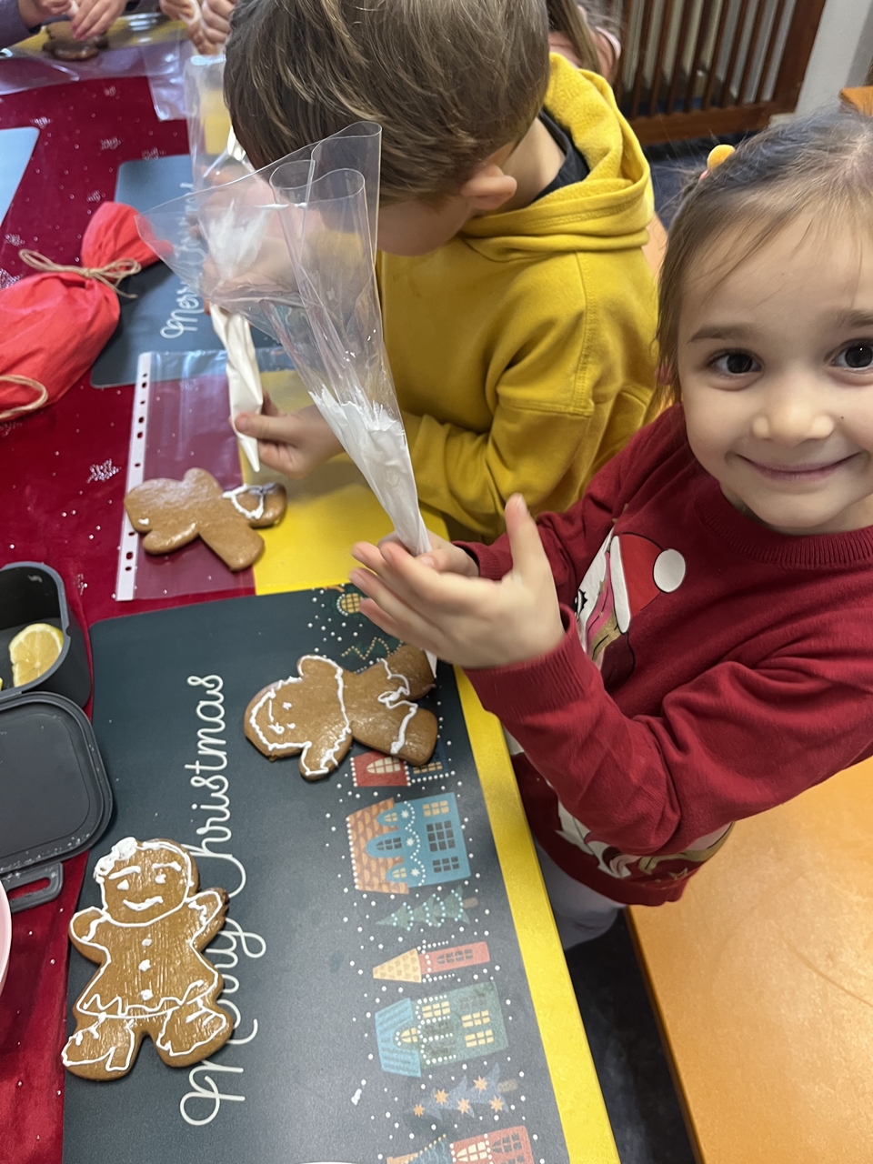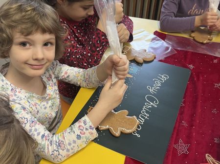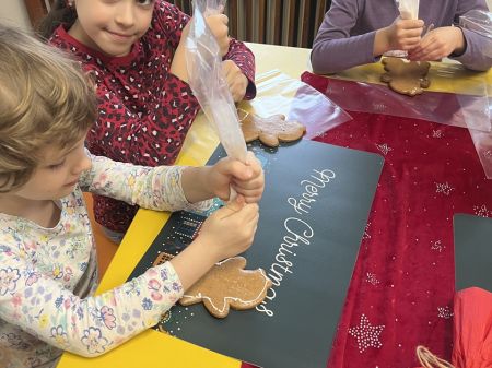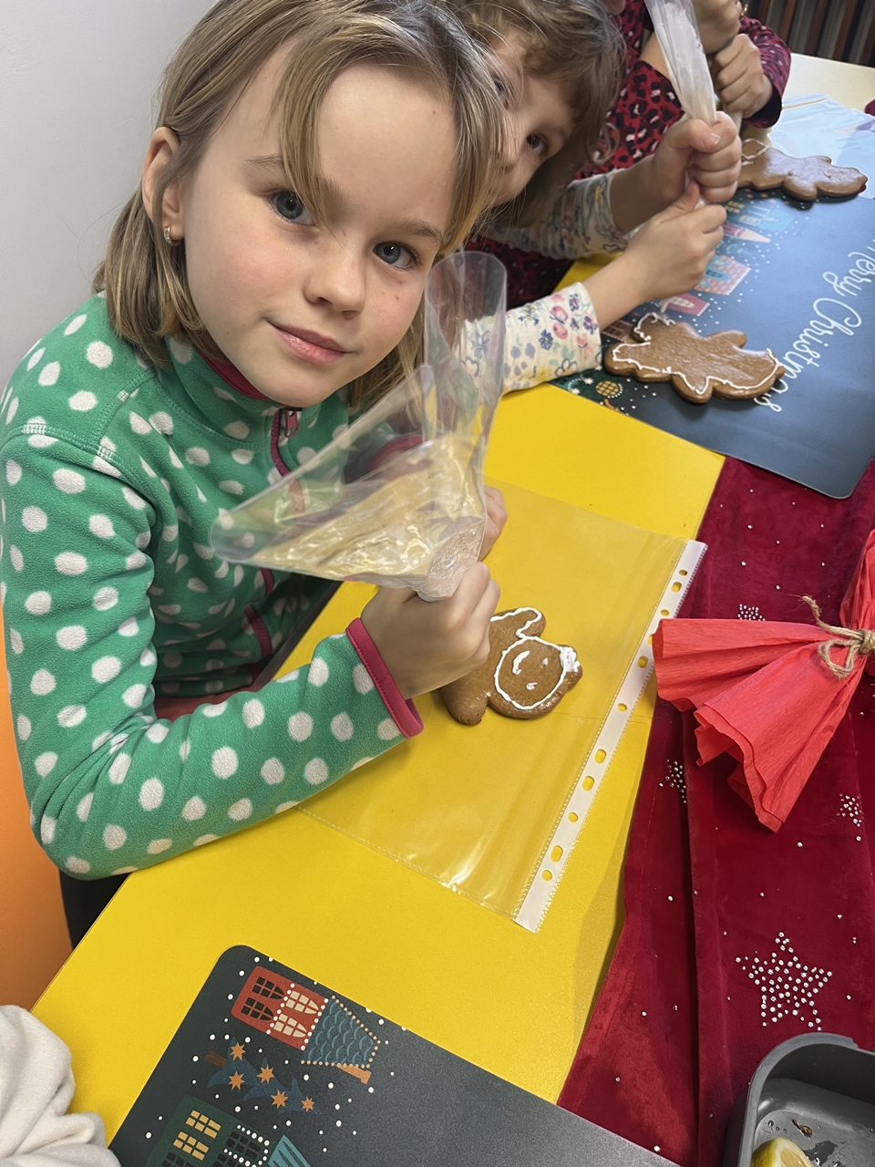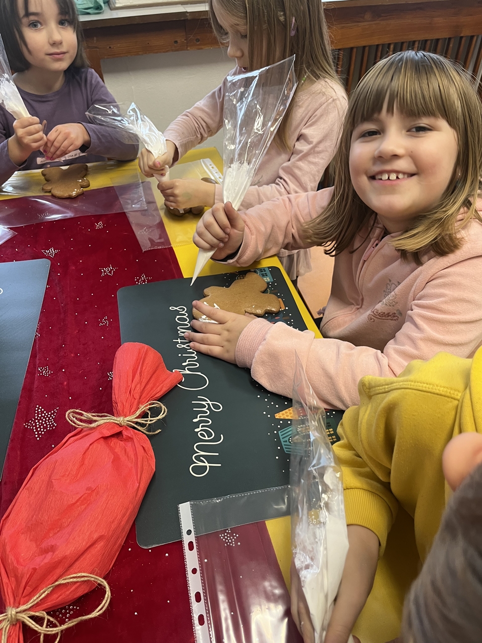 Děti se dozvěděly jak se slaví Vánoce v Anglii a dalších anglicky mluvících zemích, barvami na textil si namalovaly svou jedinečnou “Christmas Stocking” a vlastnoručně připravenou polevou si nazdobily svého vánočního perníčka “Gingerbreadman”. Děti si dopoledne skvěle užily. Posuďte sami.