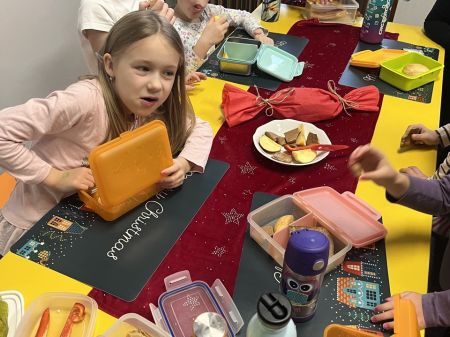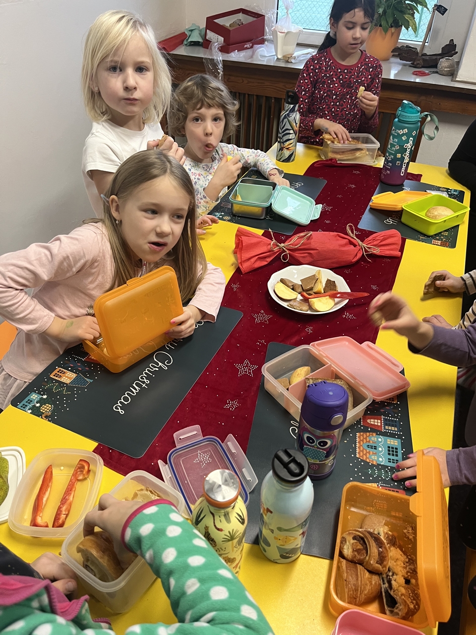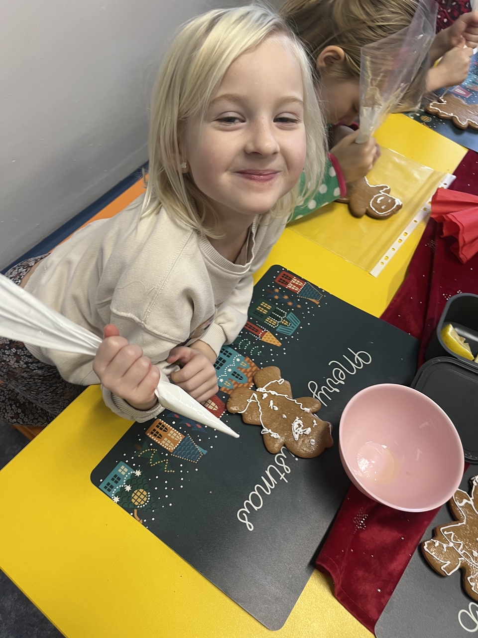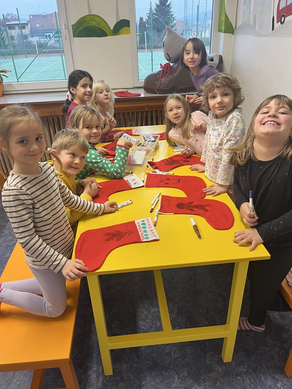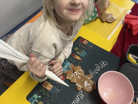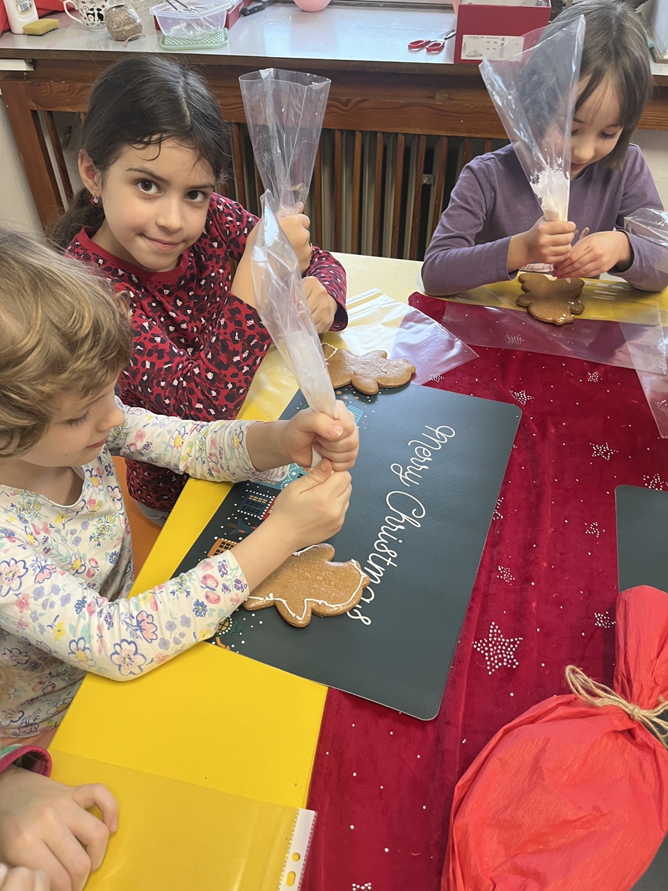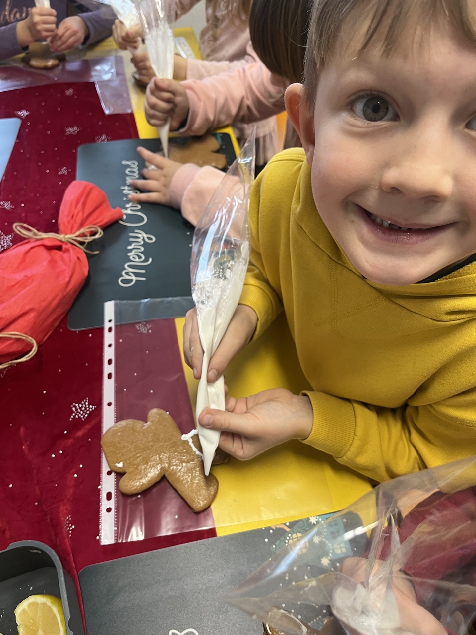 Děti se dozvěděly jak se slaví Vánoce v Anglii a dalších anglicky mluvících zemích, barvami na textil si namalovaly svou jedinečnou “Christmas Stocking” a vlastnoručně připravenou polevou si nazdobily svého vánočního perníčka “Gingerbreadman”. Děti si dopoledne skvěle užily. Posuďte sami.