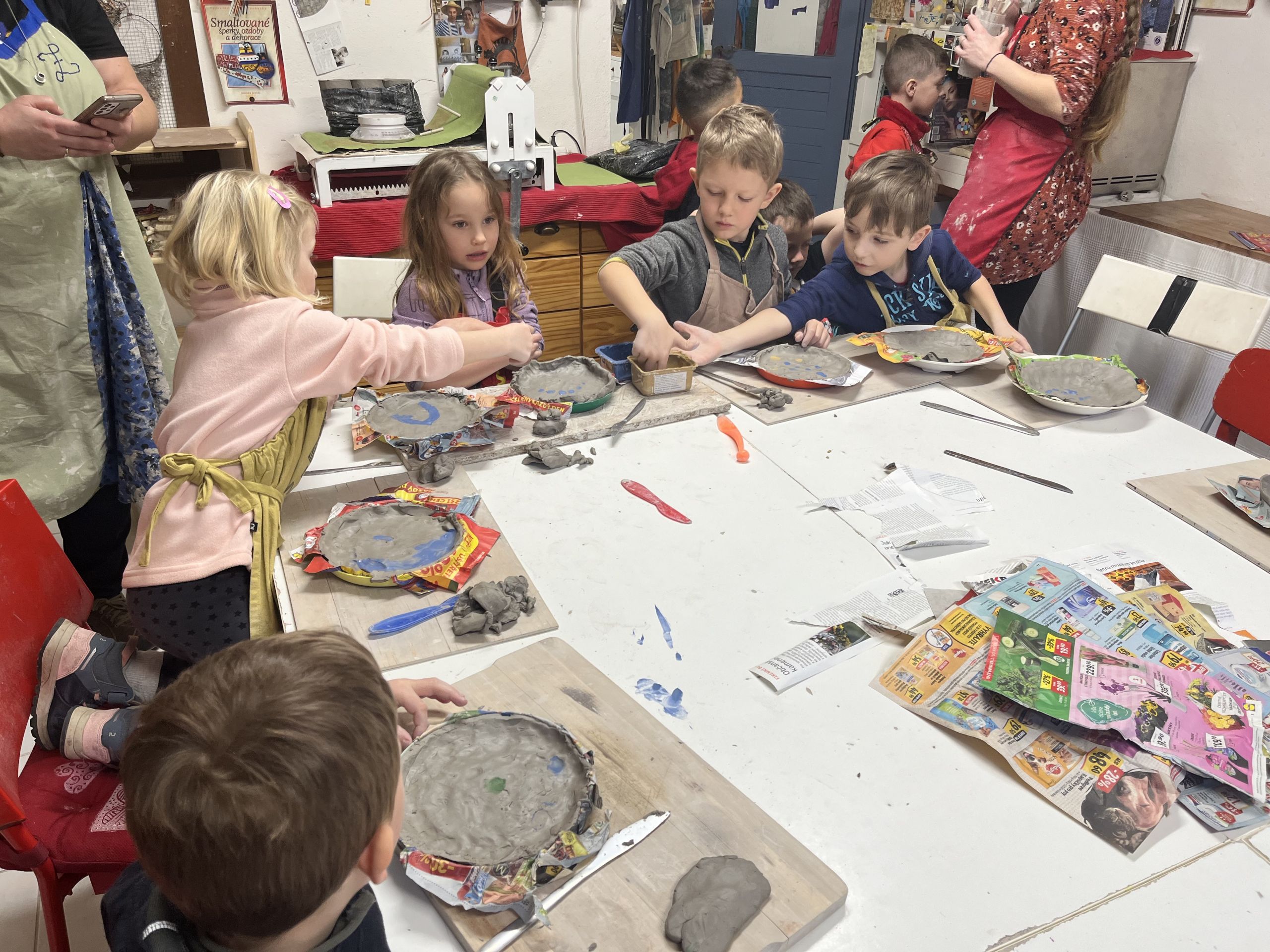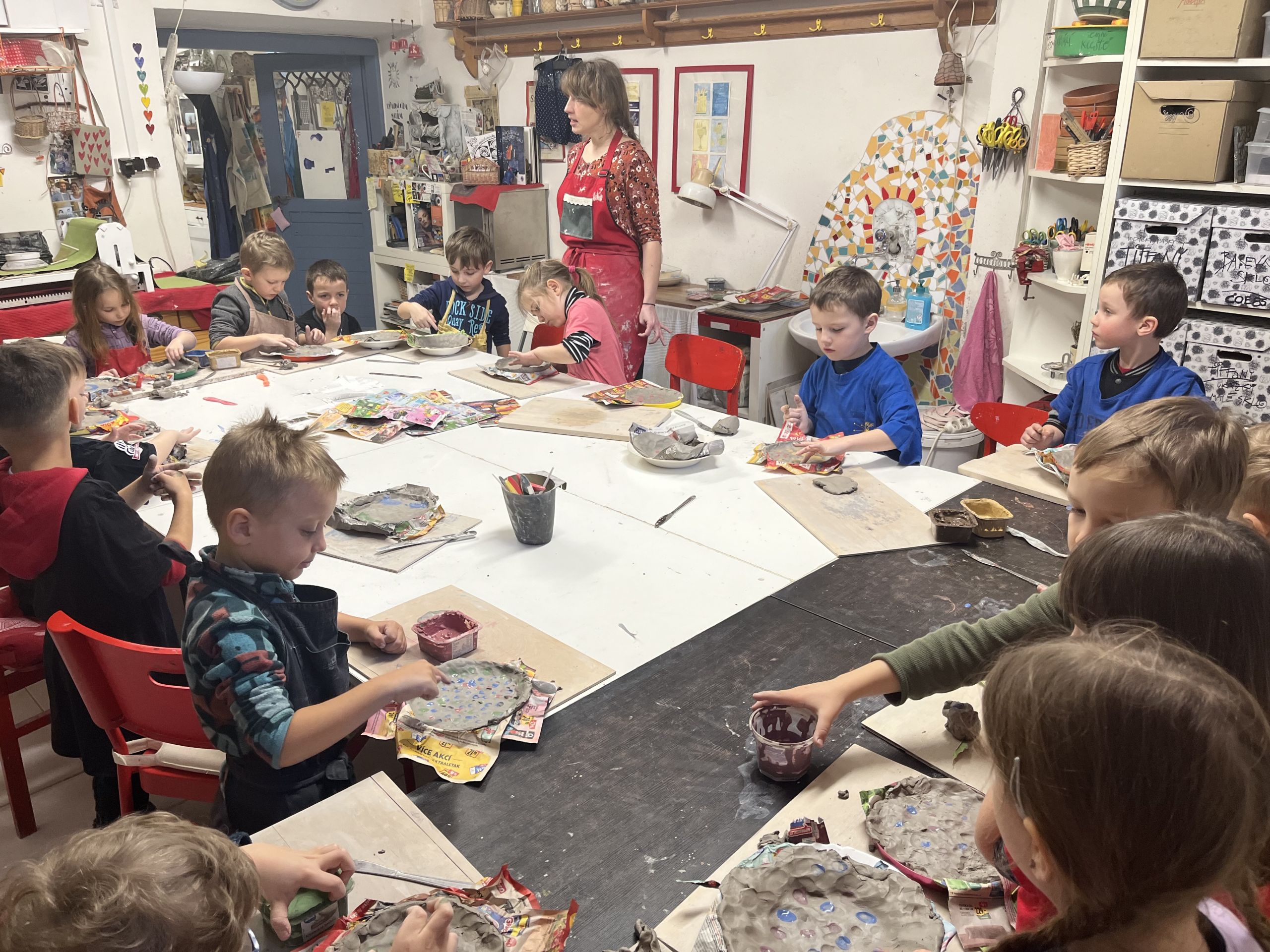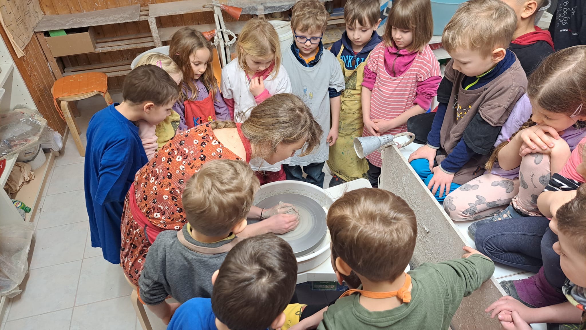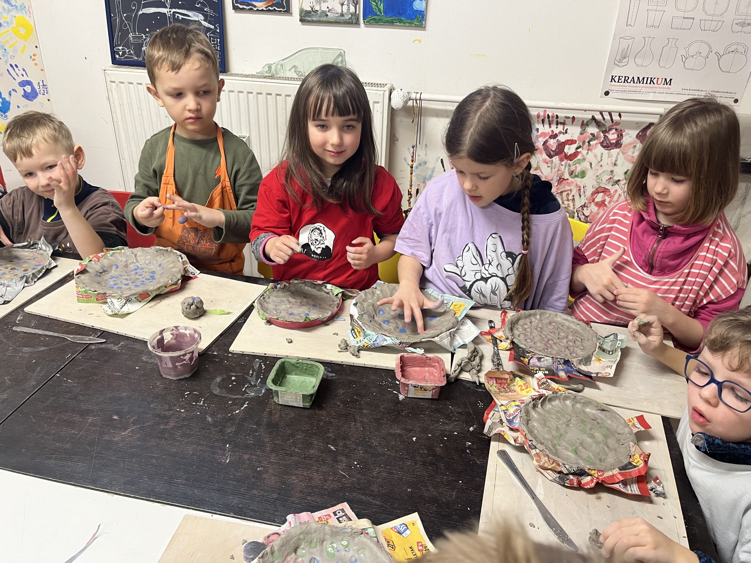 Děti se seznámily s postupem výroby hrníčku od surové hlíny až po hotový vypálený, naglazovaný výrobek. Po svačině následovalo samotné vyrábění. Každé dítě dostalo kus surové hlíny, ze které si vyrobilo talířek. Na závěr děti talířky ozdobily engobami – barvami na keramiku. Děti si vyrábění moc užily, už se těší, až se z talířku poprvé nasvačí.