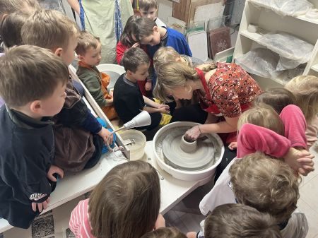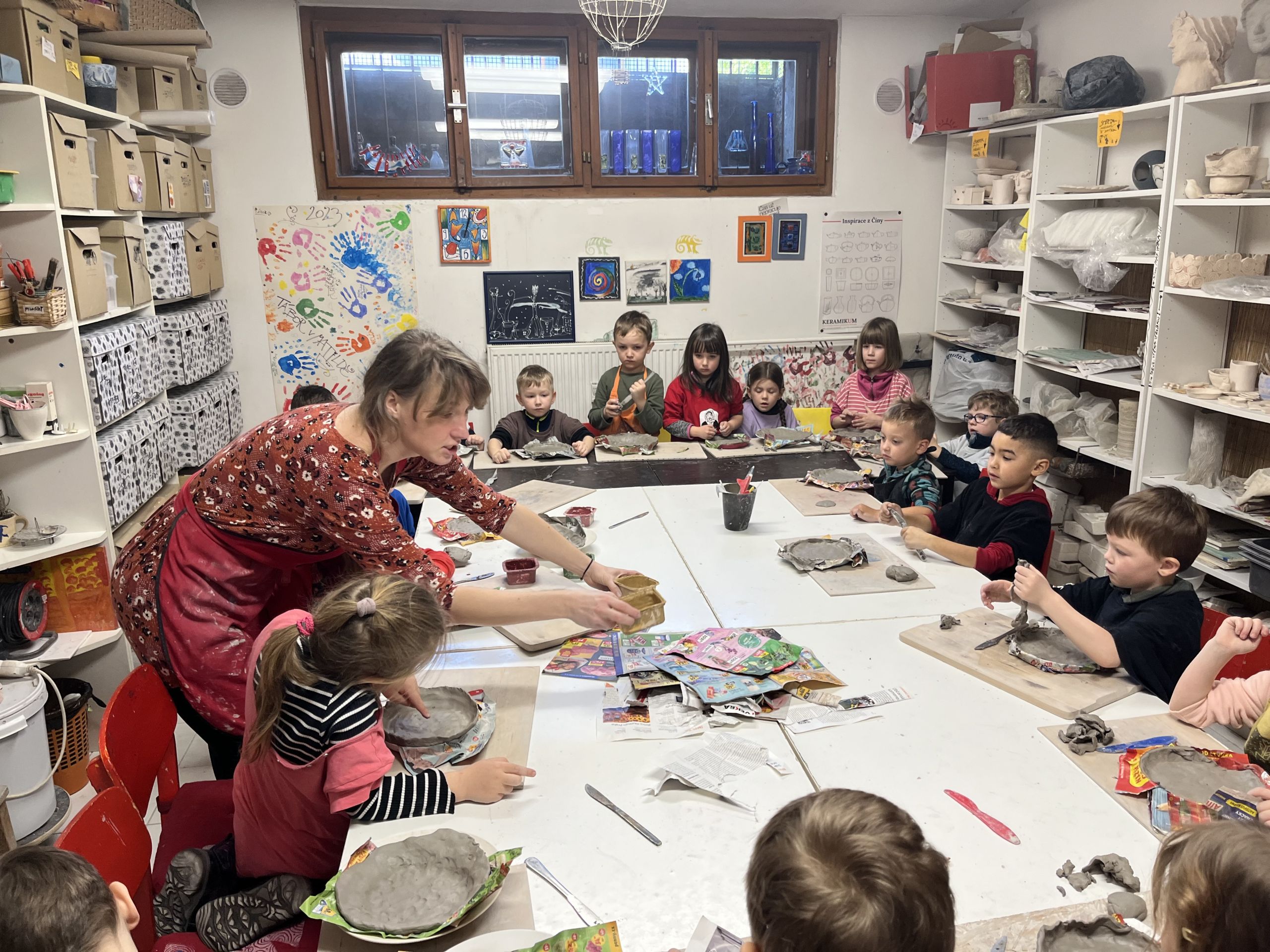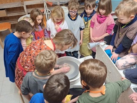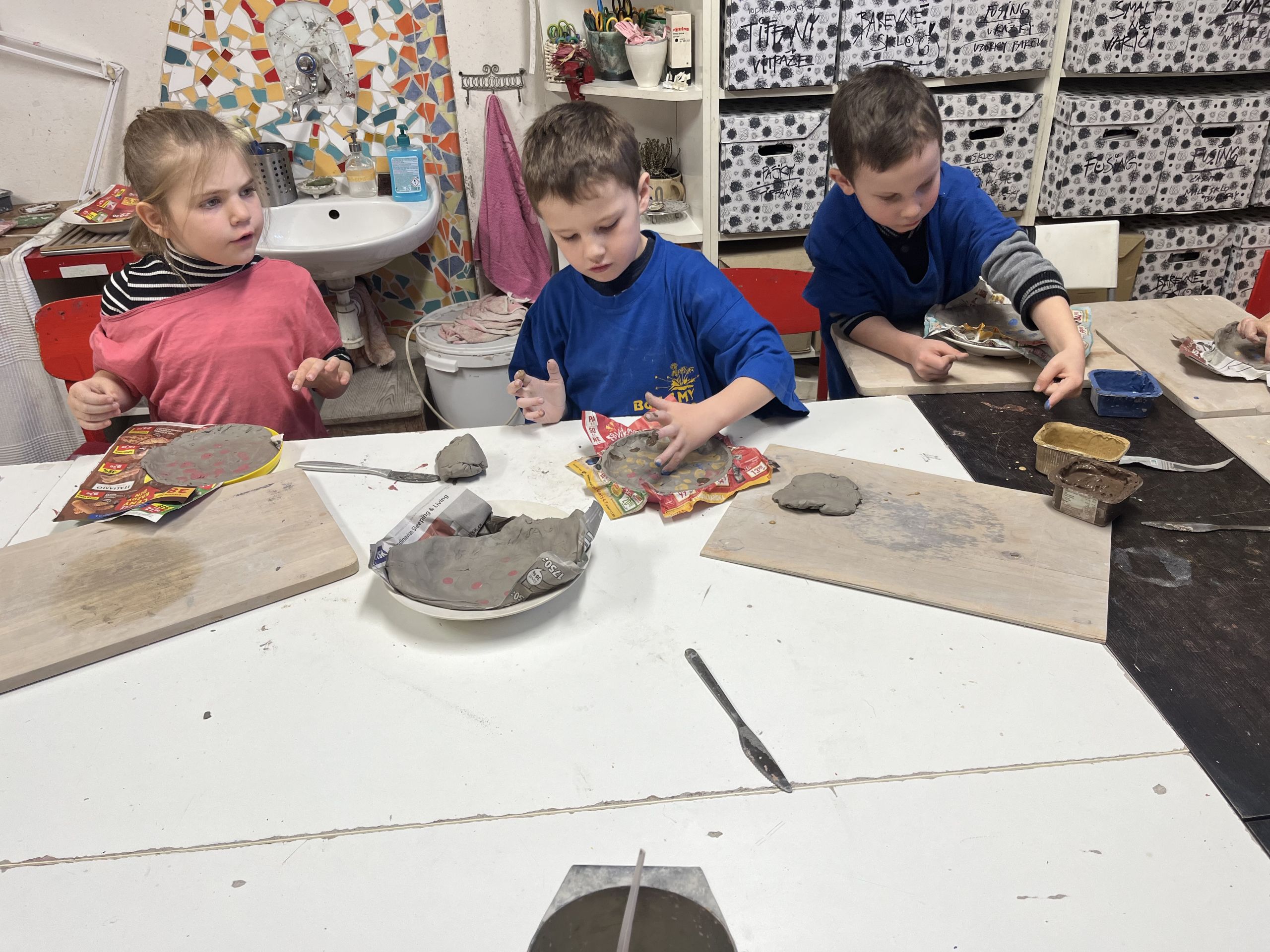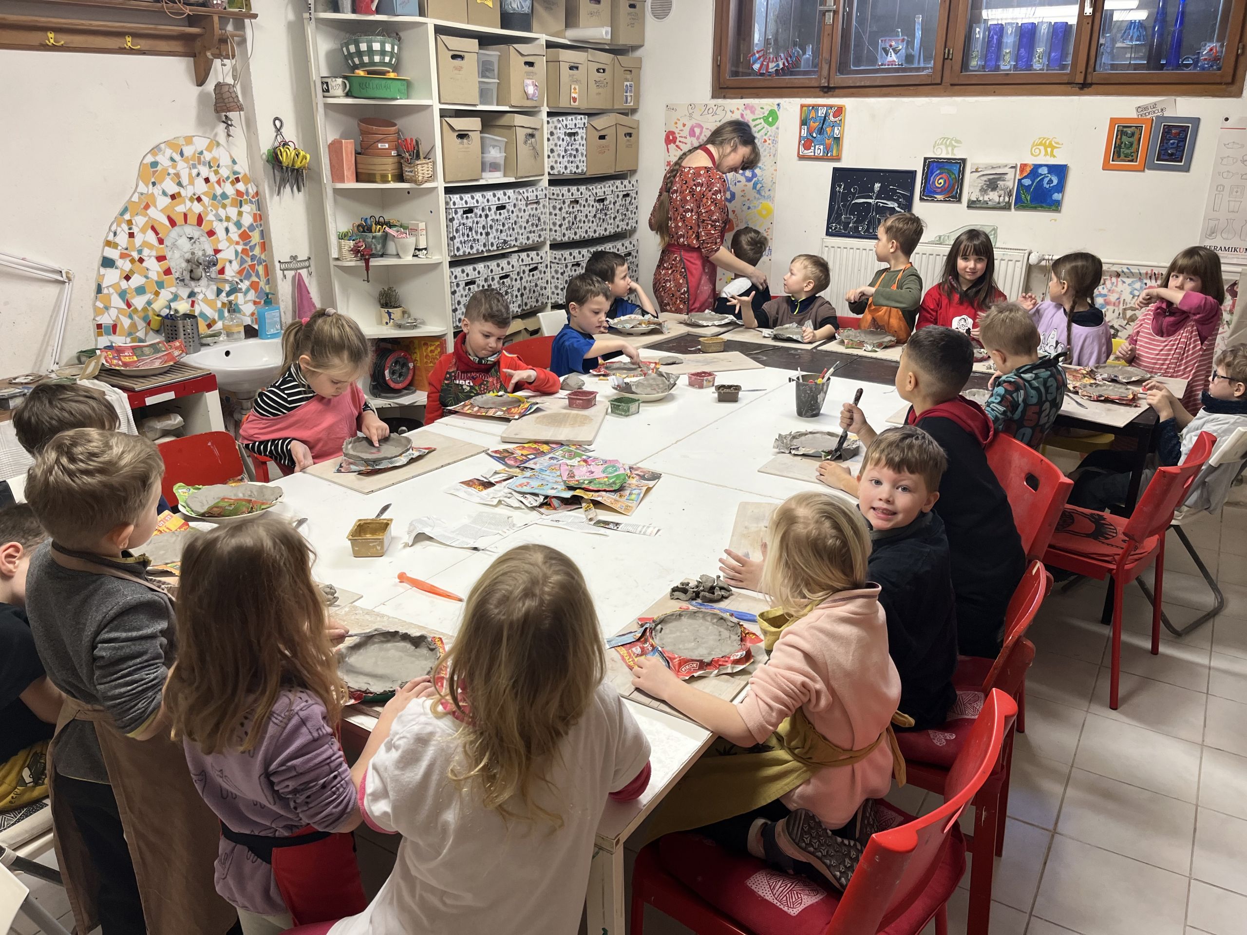Děti se seznámily s postupem výroby hrníčku od surové hlíny až po hotový vypálený, naglazovaný výrobek. Po svačině následovalo samotné vyrábění. Každé dítě dostalo kus surové hlíny, ze které si vyrobilo talířek. Na závěr děti talířky ozdobily engobami – barvami na keramiku. Děti si vyrábění moc užily, už se těší, až se z talířku poprvé nasvačí.