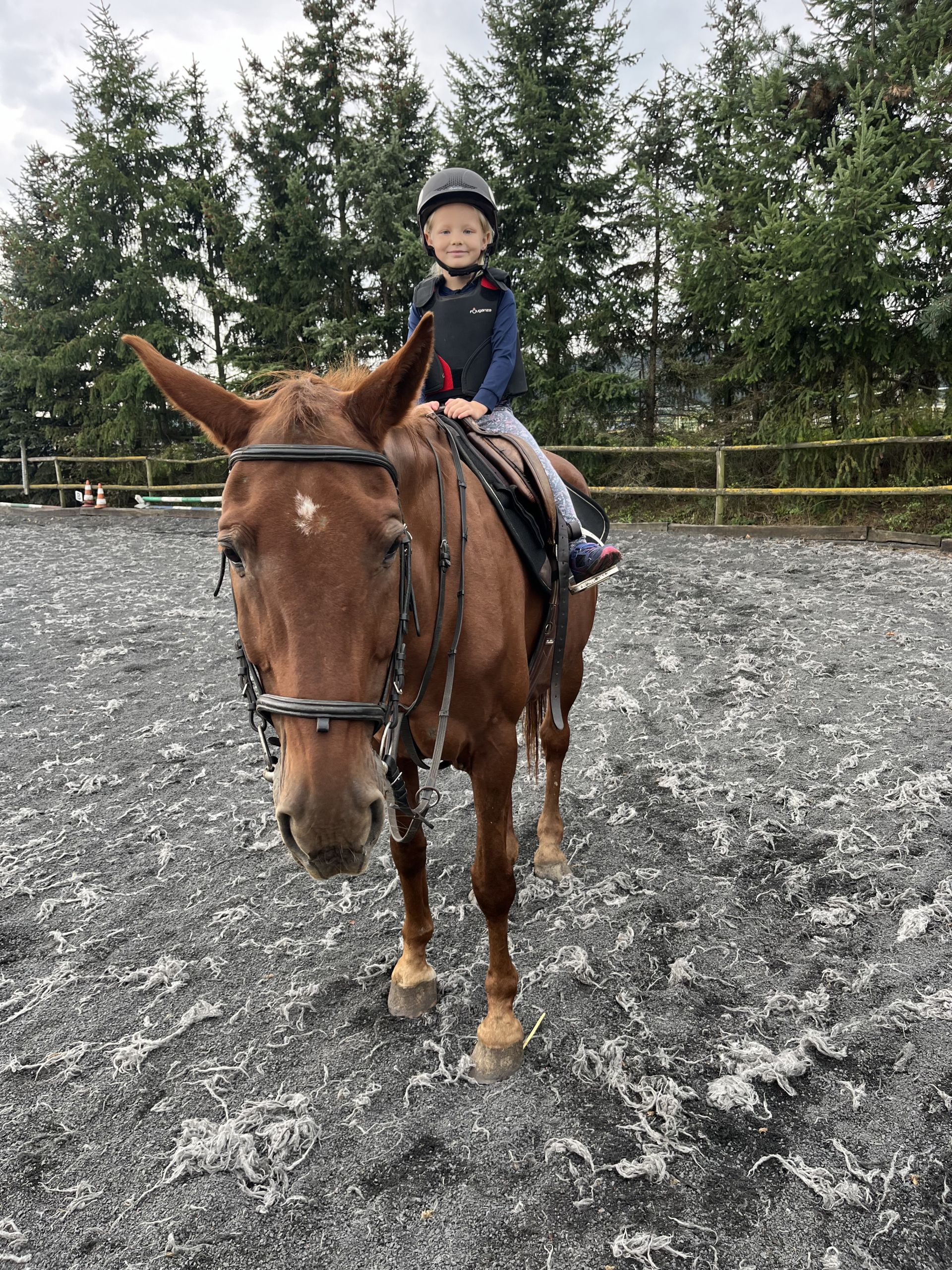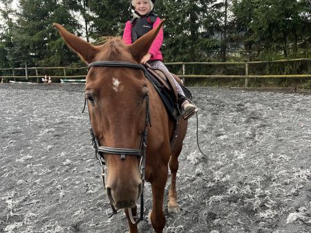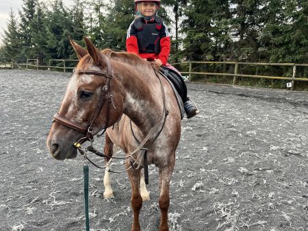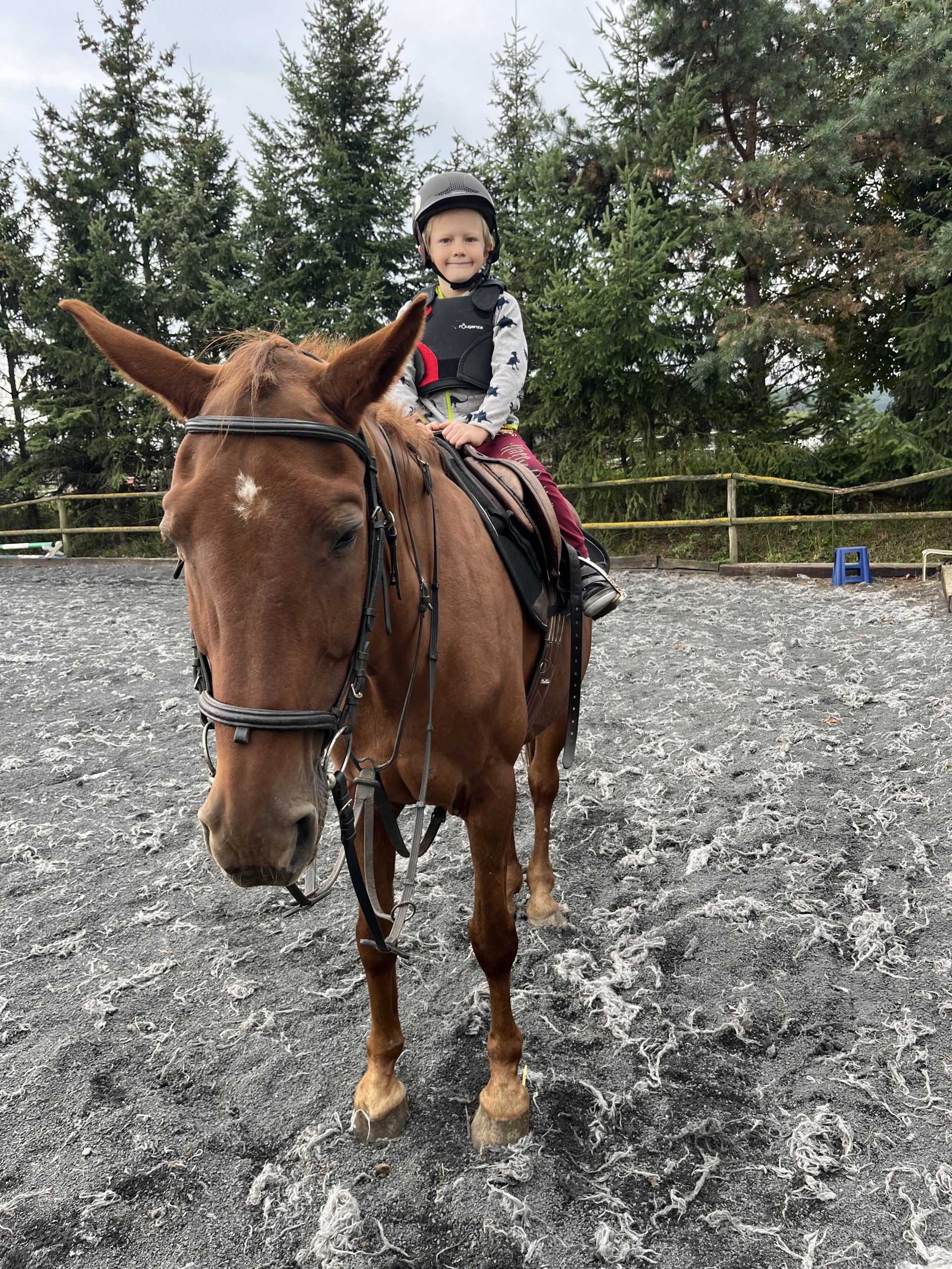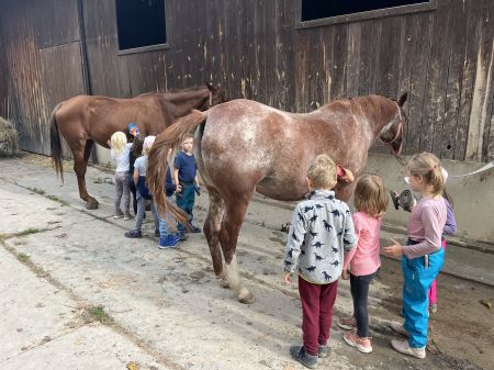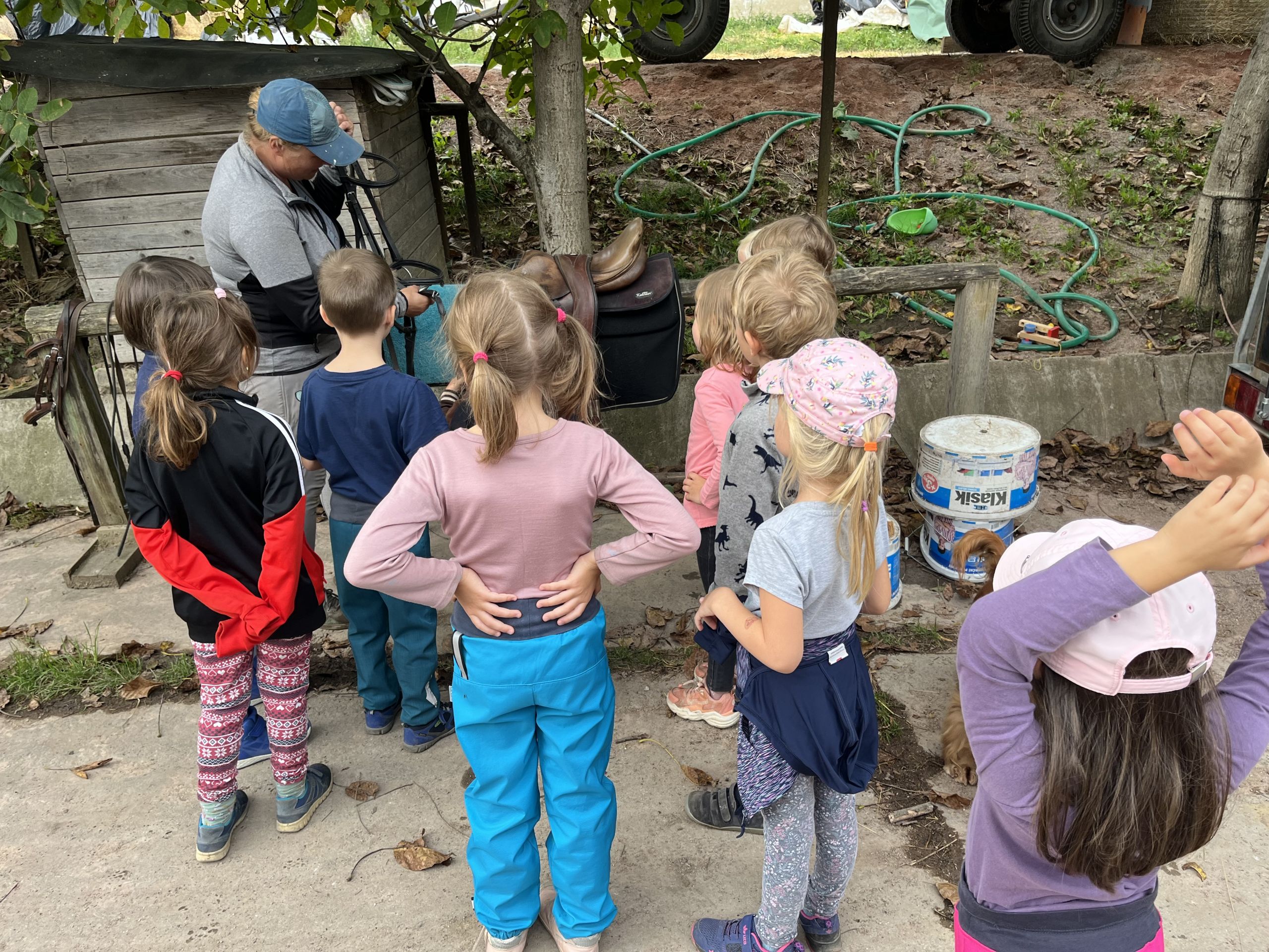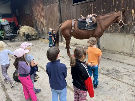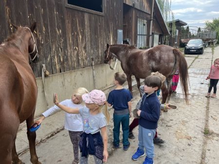 Vyzkoušeli jsme si jak se hřebelcují koně a také jsme se na nich povozili. Na závěr jsme koníky za odměnu nakrmili tvrdým pečivem, mrkvičkami a jablíčky.