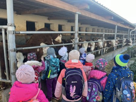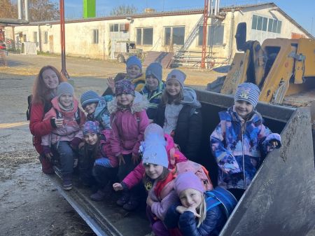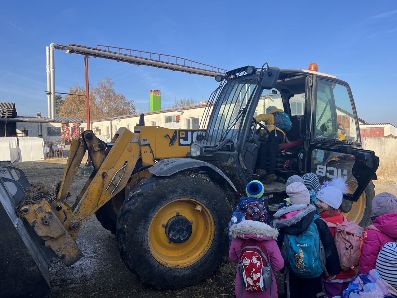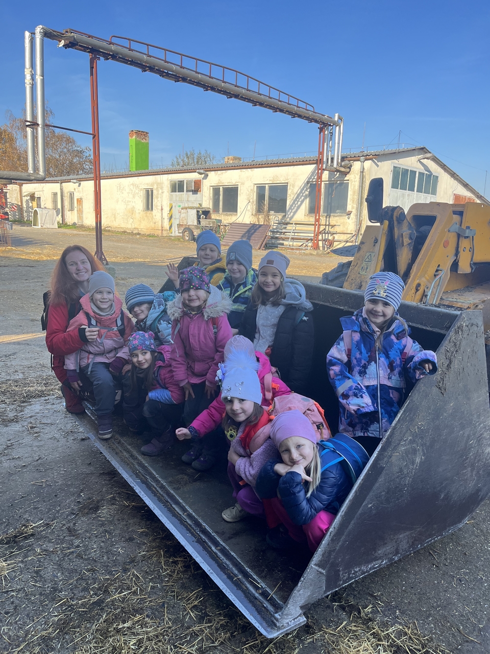 Děti měly možnost prohlédnout si býky, jalovice, telátka a prasátka, a dokonce se podívat i do kabiny traktoru a nakladače. Dozvěděly se, čím se krmí krávy, telata a prasata a jak vypadá každodenní péče o hospodářská zvířata. Výlet si všichni moc užili, většina z nás by si nejraději odvezla malé telátko domů :-).