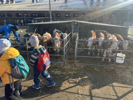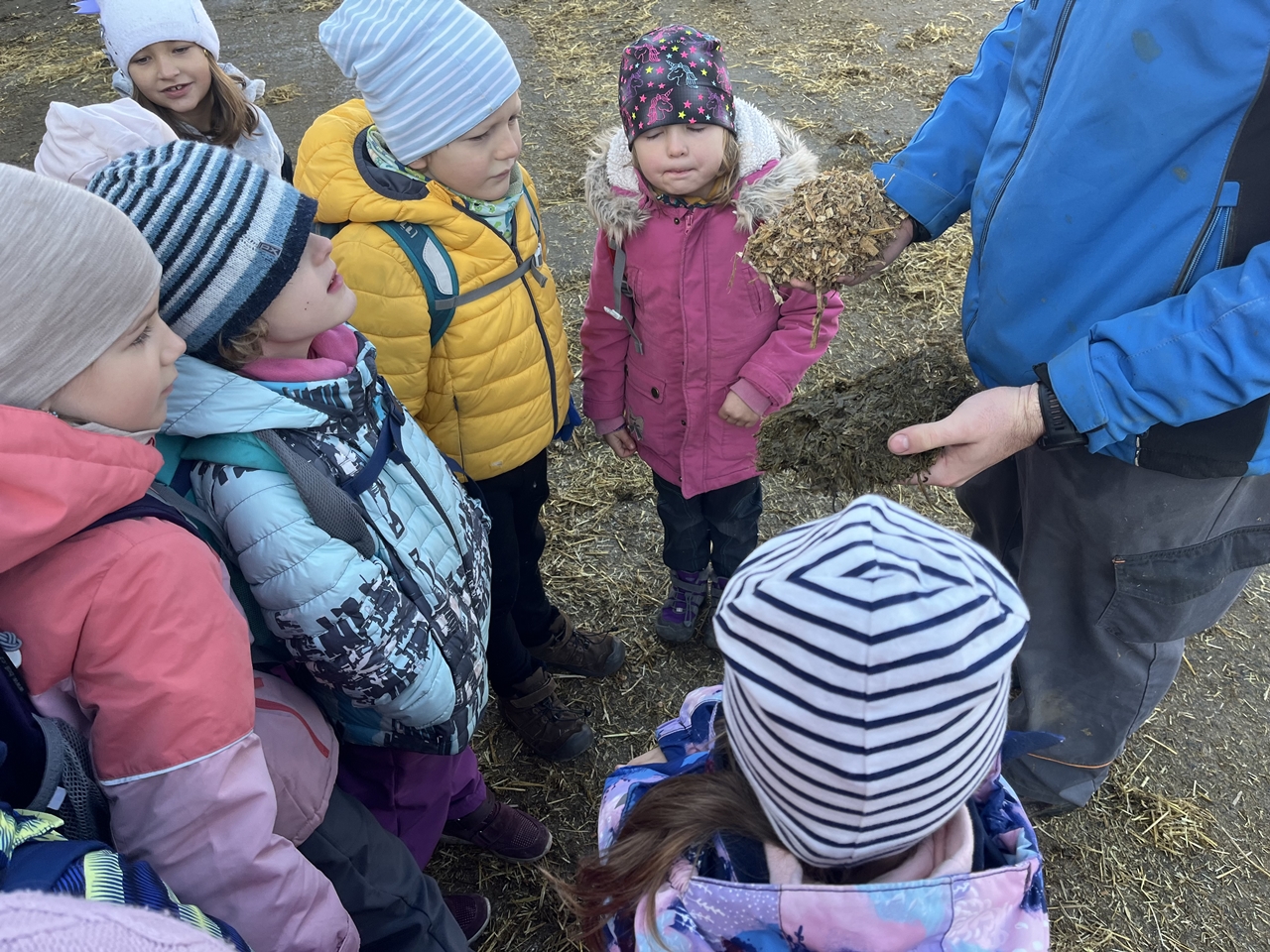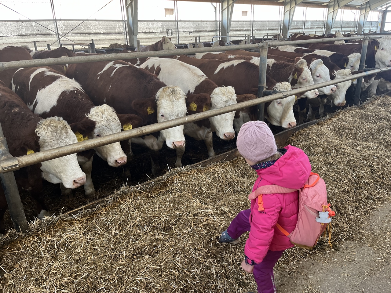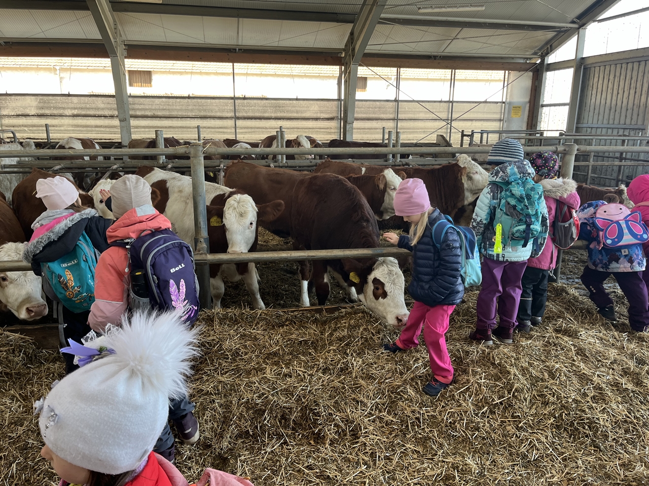 Děti měly možnost prohlédnout si býky, jalovice, telátka a prasátka, a dokonce se podívat i do kabiny traktoru a nakladače. Dozvěděly se, čím se krmí krávy, telata a prasata a jak vypadá každodenní péče o hospodářská zvířata. Výlet si všichni moc užili, většina z nás by si nejraději odvezla malé telátko domů :-).