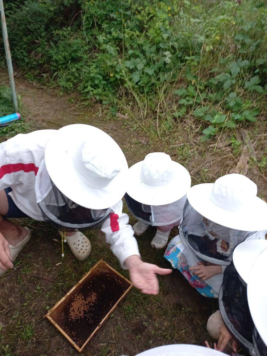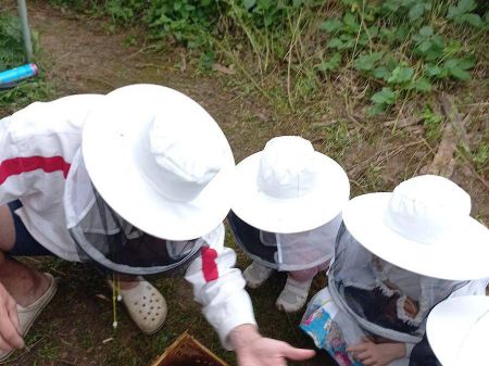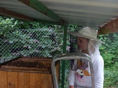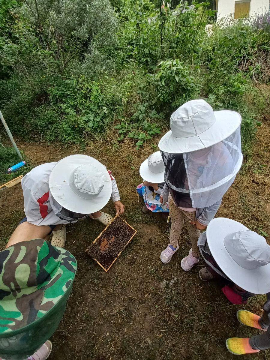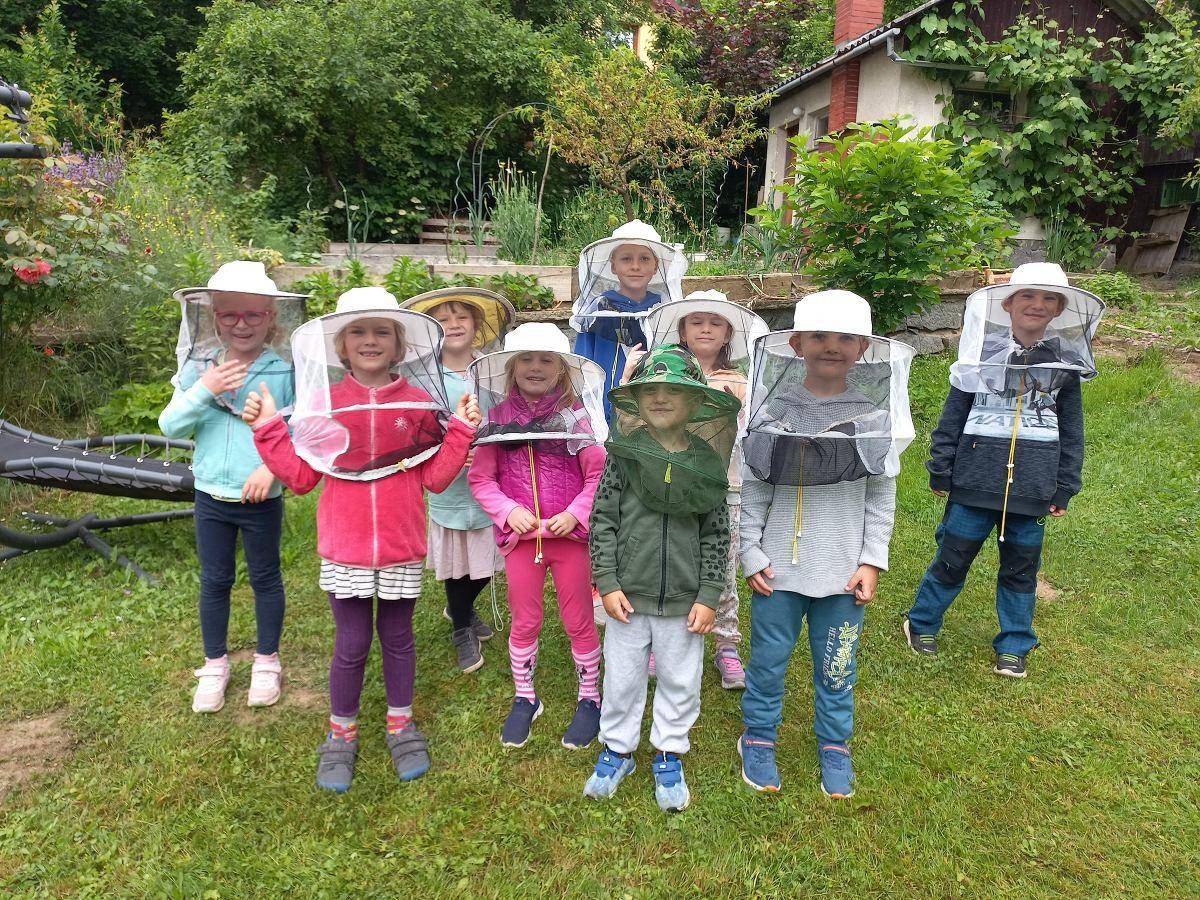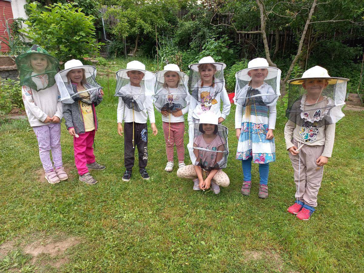 Na návštěvu nás tentokrát k sobě pozval včelař přímo z Jundrova. Na jeho zahradě jsme si nejdříve povídali o bezpečném chování v blízkosti úlů, oblékli jsme si ochranné včelařské klobouky a poté jsme úly s velkou opatrností i prozkoumali.