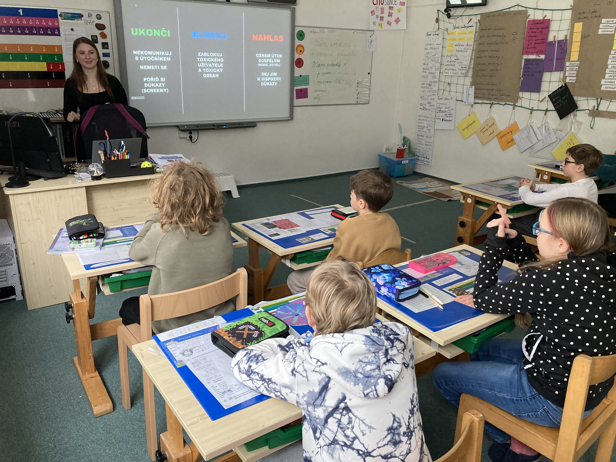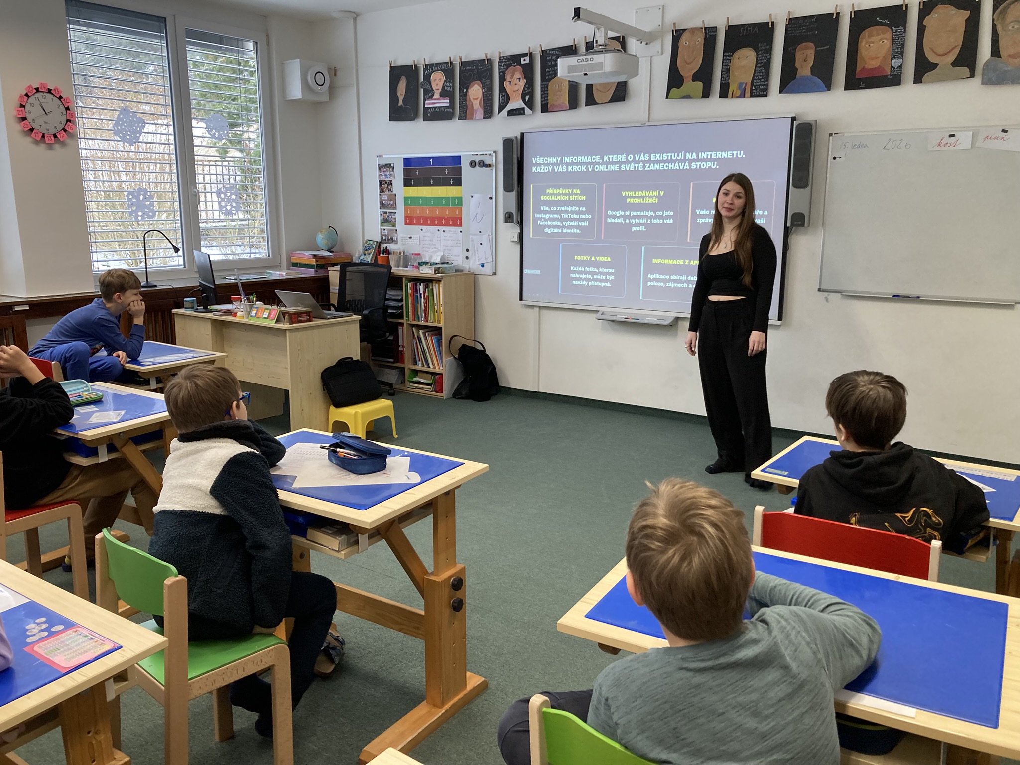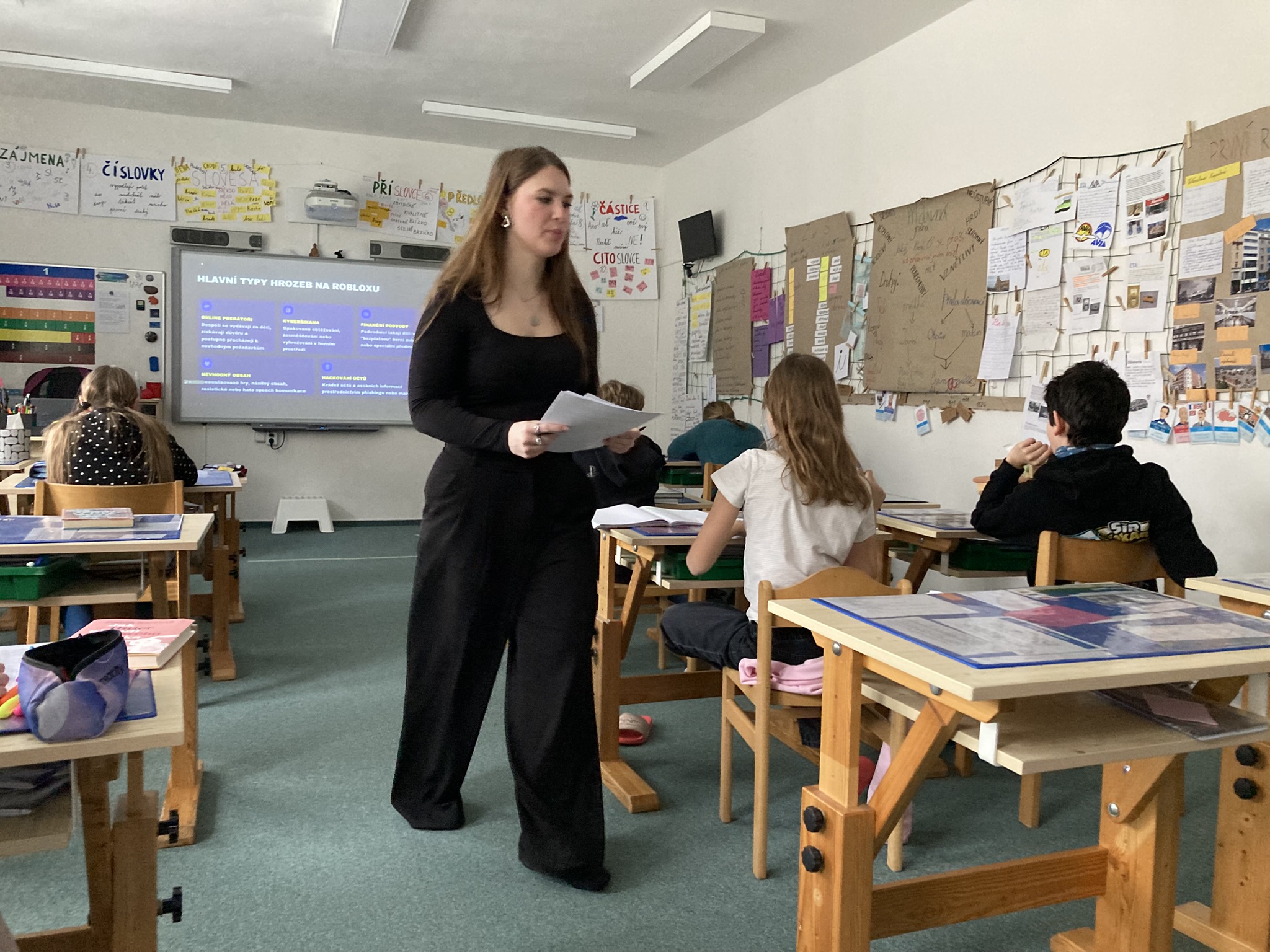 V rámci výuky informatiky odprezentovala interaktivní přednášku o kyberbezpečnosti. Zazněly pojmy jako kyberbezpečnost, kyberšikana, kybergrooming, digitální stopa a další. Děti se preventivně seznámily s bezpečnostními riziky v online světě a získaly rady, jak nebezpečným situacím předcházet a čelit. Je to další (a ne poslední) z preventivních programů, který jsme absolvovali.