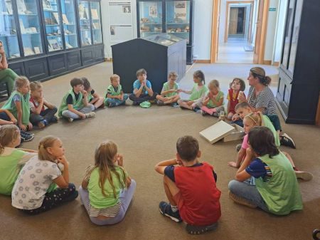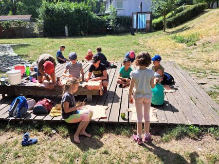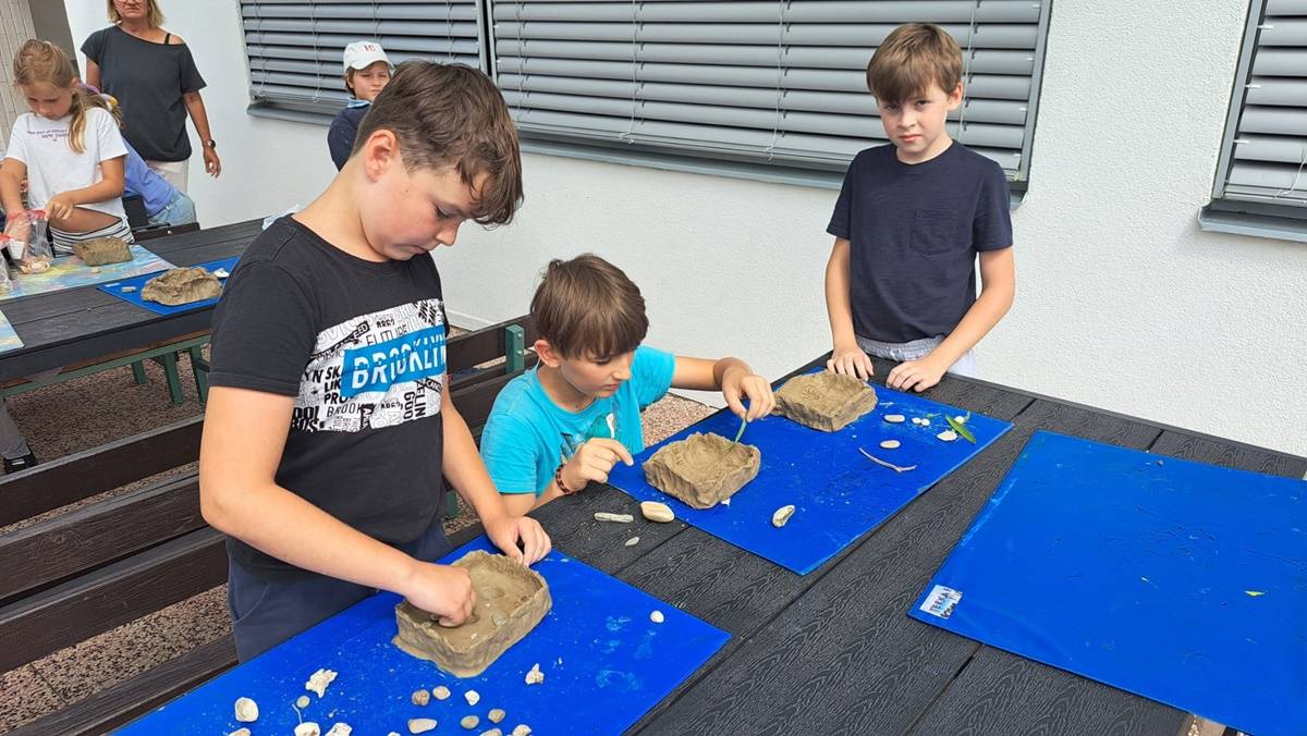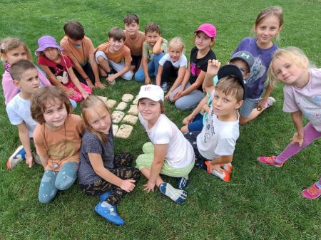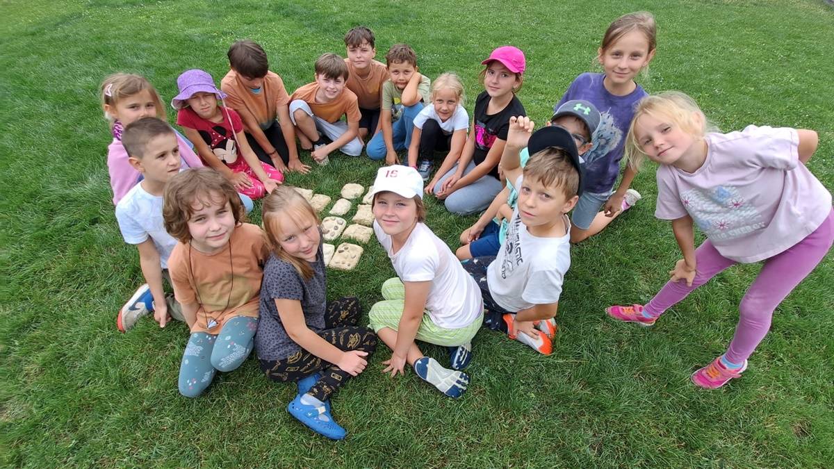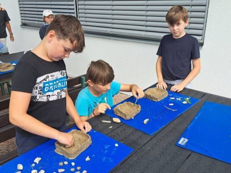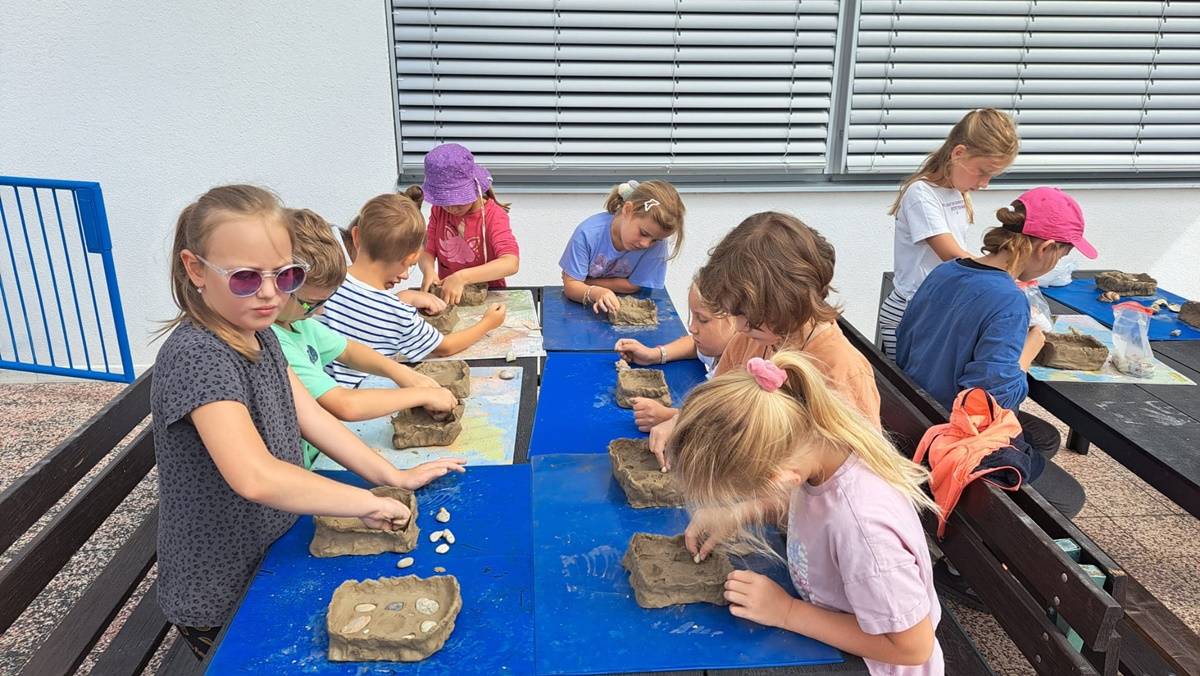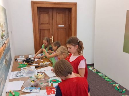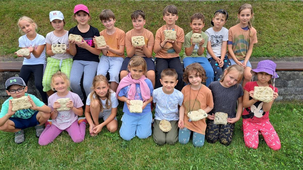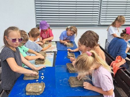 Protože nám ještě před odjezdem vlaku zbyl čas, navštívili jsme v místním muzeu výstavu Společenský život hmyzu. Z výtvarných technik jsme během týdne vyzkoušeli ještě tvorbu sádrových odlitků. Děti si připravily hliněné formy, do kterých vtiskly mušličky nebo malé kamínky. Po vylití sádrou a vyschnutí získaly vlastní “zkameněliny”. Tábor se opravdu vydařil. Na konci si děti odnesly nejen povedené výrobky, ale také spoustu zážitků a chuť k dalšímu bádání.