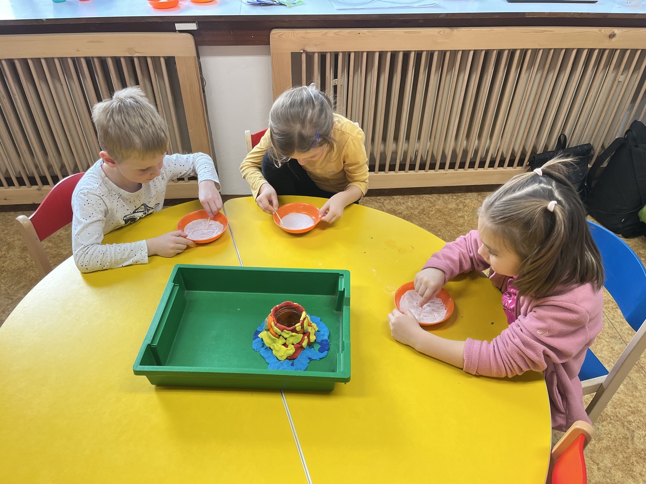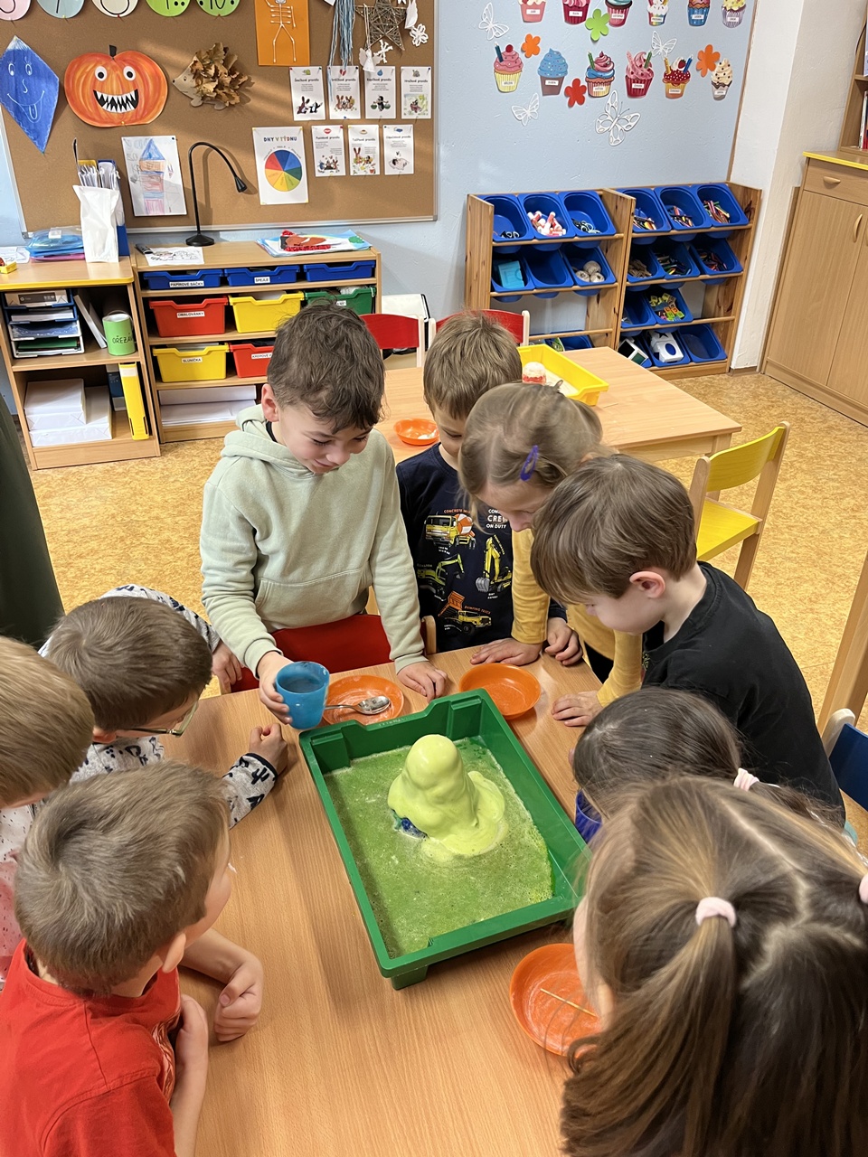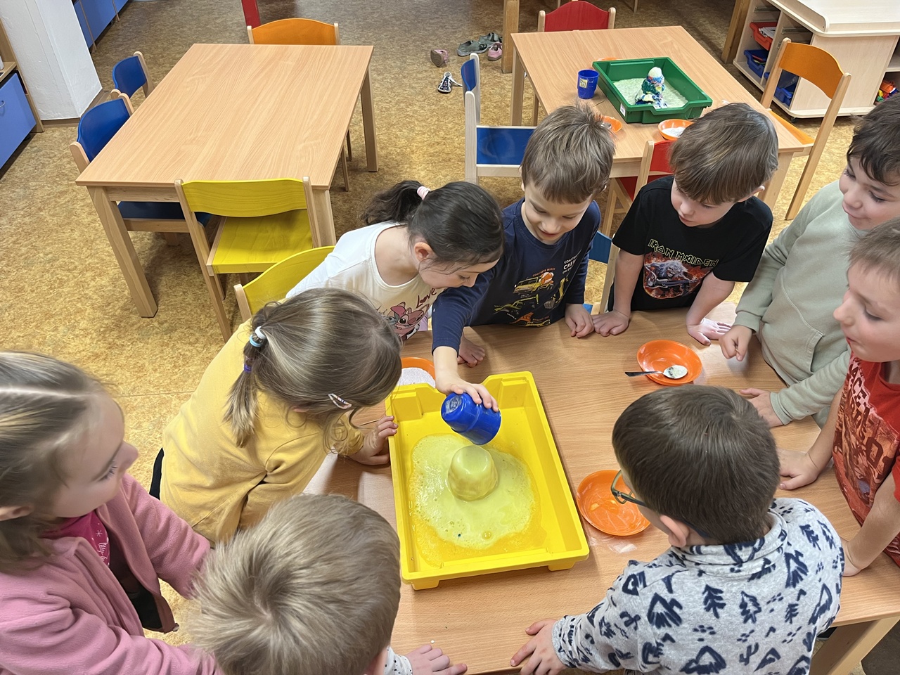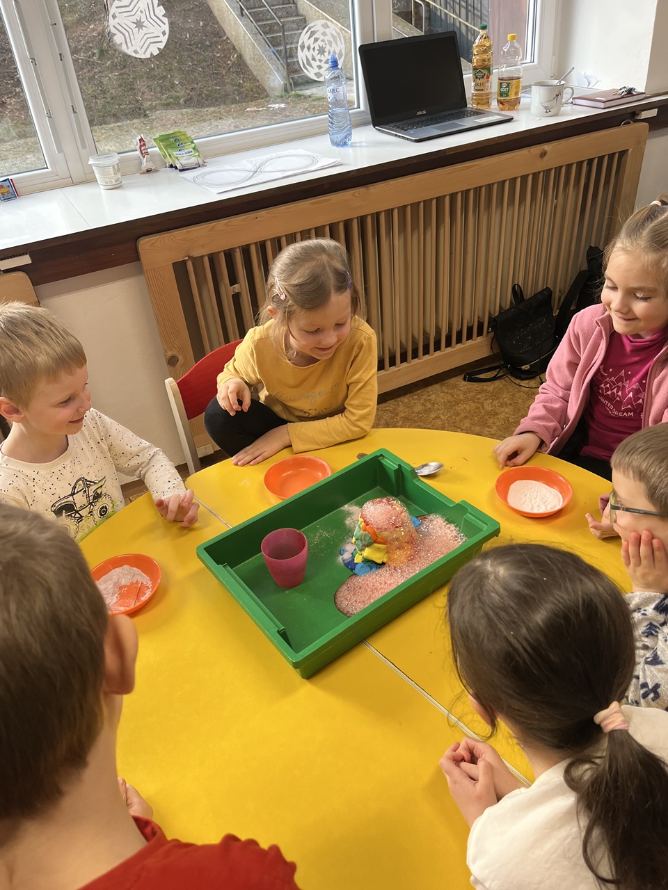 Poté si děti samy smíchaly potřebné ingredience a s nadšením sledovaly, jak sopka „vybuchuje“. Během pokusu děti spolupracovaly, vzájemně si pomáhaly a užily si spoustu zábavy.