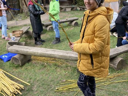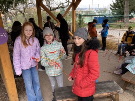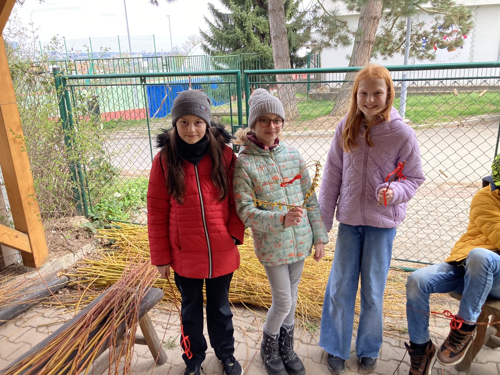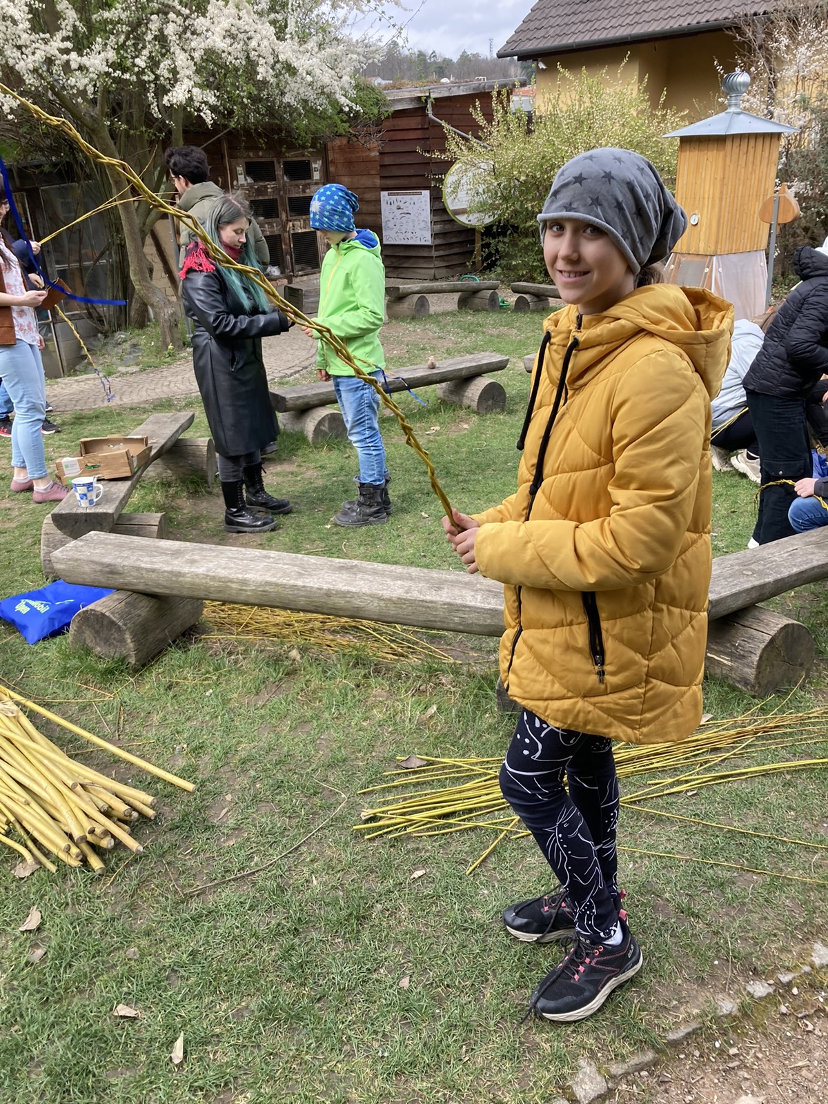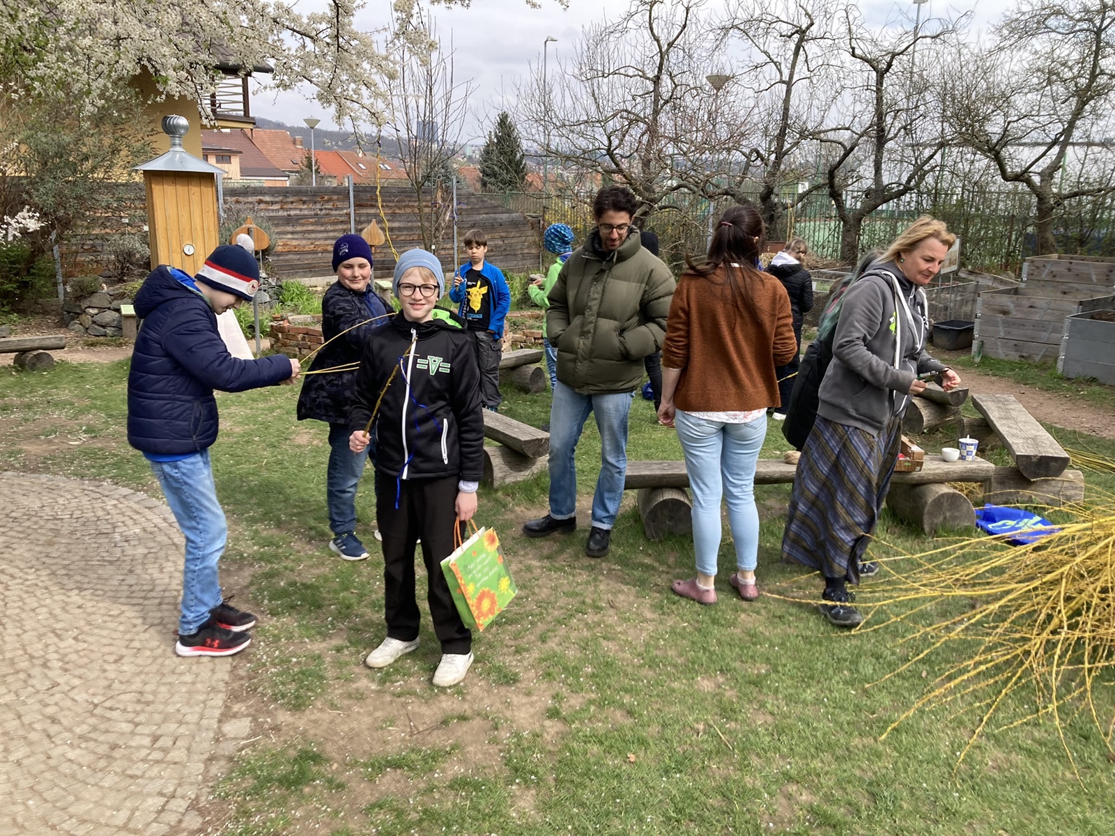 Na zahradě jsme chodili mezi jednotlivými stanovišti, kde byly nachystány dílny na výrobu jarních a velikonočních předmětů – pomlázky, vajíčka, trávové hlavy apod. Tvoření jsme si moc užili. Nezapomněli jsme si taky trochu pohrát s domácími zvířaty, která mají na zahradě svůj domov.